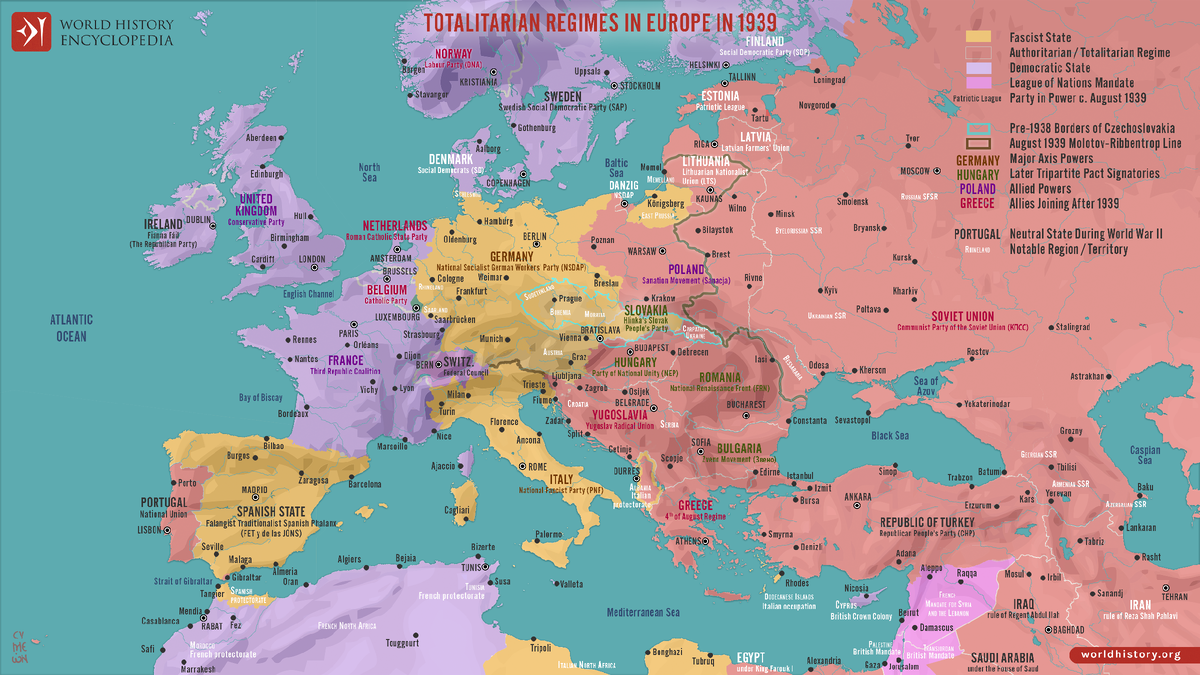 Эта карта иллюстрирует геополитическую ситуацию в Европе в преддверии Второй мировой войны (1939–1945 гг.), когда авторитаризм и тоталитаризм набирали силу на всём континенте, подпитываемые политической нестабильностью, экономическими кризисами и недовольством многих стран, вызванным изменением границ после Первой мировой войны (1914–1918 гг.). Такая обстановка привела к росту централизованных, зачастую диктаторских режимов. Несмотря на эту тенденцию, разделение между странами Оси и союзниками (противоборствующими блоками во время Второй мировой войны) не было строго связано с идеологическими различиями. Хотя фашистский режим возглавлял страны Оси — Германию и Италию, в эту группу также входили авторитарные государства, такие как Венгрия и Румыния. В число союзников, с другой стороны, входили такие демократические страны, как Великобритания и Франция, а также Польша, находившаяся под авторитарным режимом санации, и позднее Советский Союз — тоталитарное государство, присоединившееся к с