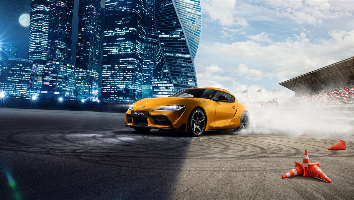 За основу я взял нехитрую идею: нужно было сделать сочетание дня / ночи и динамики / статики. И в городе можно прокатиться вечерком на стиле, и на треке, если что отжечь. Самое сложное было это реализовать. Идею предложил Алексею @the.alexgor (в инстаграме) и он согласился. Мы рисовали эскизы, подбирали ракурс и референсы. Вечер мы снимали на «Флаконе». Тут ничего интересного: мне нужны были только фары, кузов ночью и блики. На следующий день мы поехали на Moscow race way жечь резину. Кстати, столкнулись с одной проблемой. Выставили машину, как и вечером на Флаконе, но ветер был в другую сторону, пришлось переставляться в противоположную сторону. Итак, после двух дней съемок у меня были все необходимые исходники: машина днем и ночью, гоночная трасса, асфальт, дым и проч. Я предварительно выбрал почти весь нужный материал, склеил кузов, дальше уже была работа ретушера. Итого: 114 фото исходников, 566 слоев в Фотошопе. На словах все просто, но на деле — нет. Нам еще очень повезло, что в