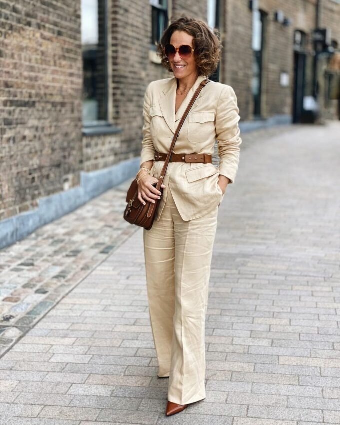 Бежевый цвет в одежде достаточно прост и удобен, его легко удается стилизовать, он хорошо объединяется с другими цветами и выглядит очень стильно. Кроме того, образы в бежевых тонах смотрятся нескучно, дарят ощущение комфорта и практичности, поэтому дамам возраста 50+ подходят как нельзя лучше. 1. Изящный льняной костюм, который составлен из прямых брюк со стрелками и тонкого жакета, надетого в качестве первого слоя, - отличный пример бежевого тотал лука. Изящество и элегантность наряда подчеркивается темно-коричневым широким кожаным ремнем, застегнутым на талии поверх жакета, сумочкой небольшого размера и туфлями с острыми носами в тон. Наряд получается более чем эффектным и стильным, в рамках повседневного и даже офисного стиля он будет уместен. 2. Элегантное сочетание укороченных и подвернутых на щиколотках прямых брюк, золотистого мягкого джемпера и пальто классического кроя - приятное для глаз и невероятно стильное решение в монохромной бежевой и бежево-золотистой цветовой гамме.