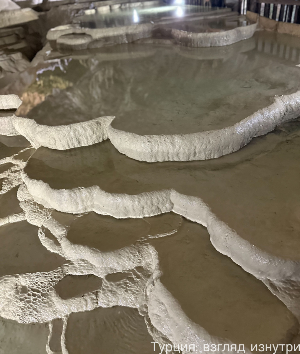 Практически весь мир знает о знаменитых белоснежных травертинах Памуккале, но немногие знают, что его "мини-копия" скрывается неподалеку, в пещере Каклык. Это уникальное чудо природы расположено всего в 41 километре от Памуккале и в 36 километрах от города Денизли. Пещера, расположенная в районе Каклык (от которого и получила своё название), завораживает своими белоснежными травертиновыми бассейнами. Первое, что встречает посетителей при входе в пещеру, — это резкий запах сероводорода. Однако, спускаясь в глубину, начинаешь постепенно привыкать к нему. 190-метровый маршрут внутри пещеры проложен по деревянной лестнице с перилами, что позволяет удобно и безопасно передвигаться по пещере. Бассейны в пещере Каклык расположены каскадами, их стены и края украшены необычными отложениями минералов, напоминающими террасы Памуккале. Из-за высокого содержания цинка и известняка вода здесь придаёт этим террасам особый оттенок и текстуру. Потолок пещеры впечатляет сталактитами и сталагмитами,