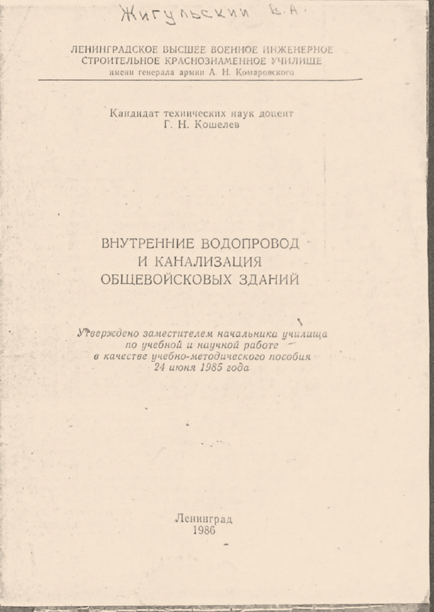 Эта методичка, составленная к.т.н, доцентом Г.Н. Кошелевым, рассматривает комплексный подход к проектированию внутренних сетей ВК и ее можно назвать эталонной почти спустя 40 лет, т.к. она соответствовала тогдашним актуальным нормативам и практикам. Более адекватных материалов для подготовки студентов мне найти еще не удавалось. И это меня удивляет, почему у военных комплексный подход к подготовке ВК был (не знаю, есть ли сейчас), а в наших главных строительных ВУЗах какой-то бардак и расчлененка.