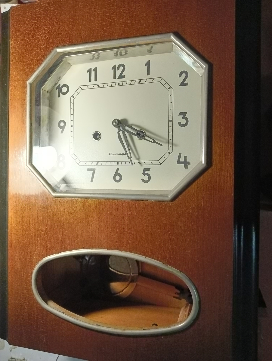 Доброго времени суток! Часы Янтарь поступили в ремонт - часы идут нормально, владелец попросил настроить бой. Стекла нижнего нет, у меня такого в наличии нет. Состояние часов нормальное, только отвалился деревянный уголок внутри корпуса. Струны немного погнуты, но целые, видимо кто то пытался что то в них отрегулировать. Механизм нормальный, думаю еще поработают. Из колёс вынул инородный предмет - кусочек монтажной пены, может это и причина поломки? Молоточки установлены неправильно - видимо из за этого часы и не били. Выровнял предварительно молоточки, после установки в корпус механизма еще немного подправлю если что. Установил механизм, молоточки пришлось регулировать, что бы все струны равномерно звучали. Часы запустил, ещё стрелки переставлял - били неправильно, не в том месте. Часы идут, бьют хорошо. Проверю пару деньков и можно отдавать владельцу. Всем удачных ремонтов!