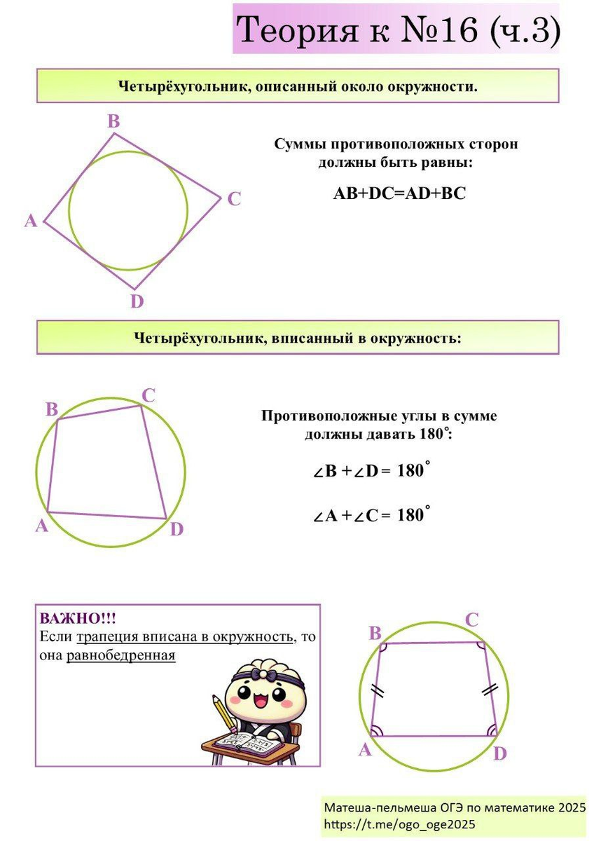 теория к этой теме МИНИМАЛЬНА,но может принести Тебе целый балл на экзамене!!!! Исходя их этого: НЕЛЬЗЯ ВПИСАТЬ В ОКРУЖНОСТЬ: ромб, параллелограмм, трапеция (КРОМЕ РАВНОБЕДРЕННОЙ, её можно)
