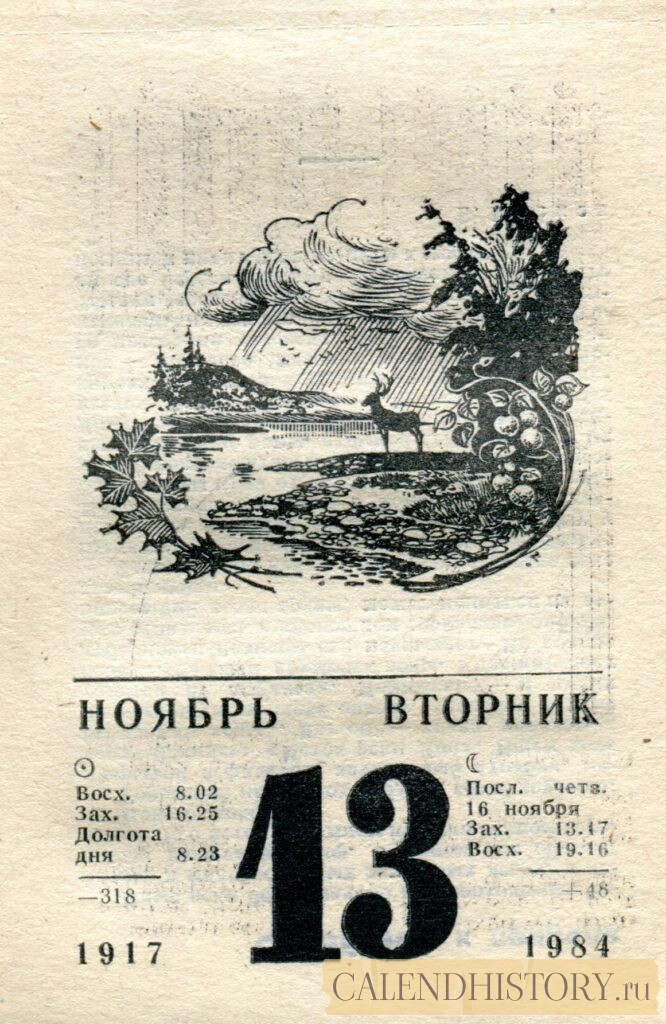 Итак, сегодня 13-го ноября и у нас на календаре 1984-й год. Перед нами листок советского календаря для женщин за этот день.