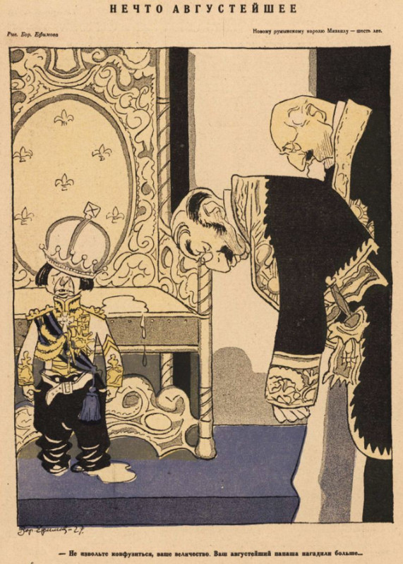 А это самая первая, вероятно, карикатура на него, напечатанная в журнале «Смехач» в 1927 году, когда никаких особых причин для симпатии к этому монарху в СССР ещё не было. Борис Ефимов (1900—2008). «Нечто августейшее. — Не извольте конфузиться, ваше величество. Ваш августейший папаша нагадили больше... Новому румынскому королю Михаю — шесть лет». Юный Михай в головном уборе североамериканских индейцев В 2005 году на торжествах в Москве по случаю 60-летия Победы Другие материалы автора блога можно увидеть на канале