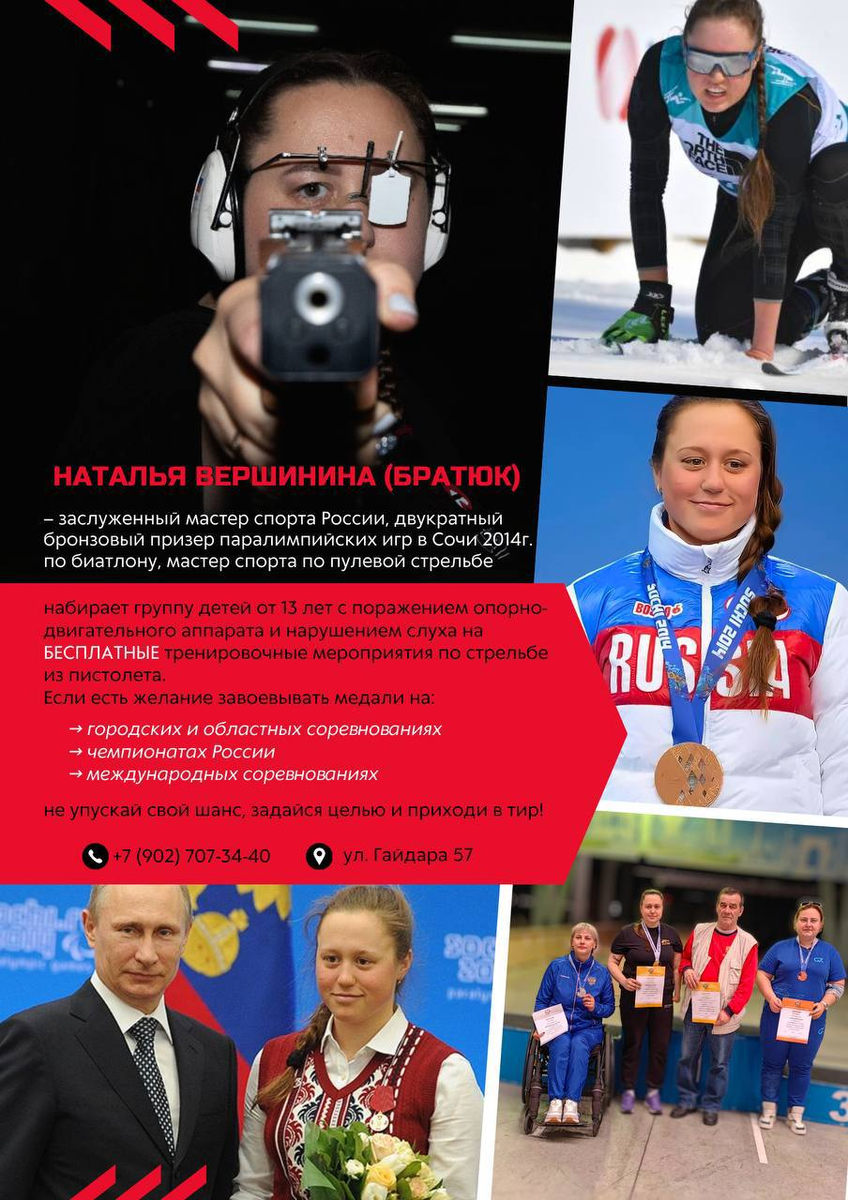 Студенты с ОВЗ получат возможность посещать тир и освоить навыки стрельбы по мишеням, а занятия для них будет проводить Наталья Вершинина – заслуженный мастер спорта России, двукратный бронзовый призер параолимпийских игр в Сочи 2014 года по биатлону, мастер спорта по пулевой стрельбе. С 2020 года Ресурсный центр инклюзивного образования САФУ сотрудничает со «Спортивно-адаптивной школой паралимпийского и сурдлимпийского резерва». В рамках сотрудничества ключевым направлением совместной деятельности является популяризация физической культуры и спорта людей с инвалидностью, центр содействует включению студентов с ОВЗ в спортивные мероприятия регионального и всероссийского уровня, оказывает поддержку молодым спортсменам в возможности принимать участие в соревновательных мероприятиях. В 2024 году новым направлением в отрасли спорта для студентов с особыми образовательными потребностями стала пулевая стрельба. Наталья Вершинина подчеркнула, что тренировки – это не только физическая подготов