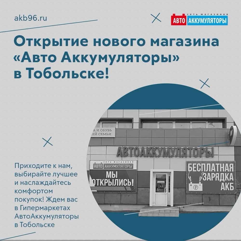 Автолюбители Тобольска, в вашем городе открылся новый магазин сети «АвтоАккумуляторы» по адресу ул. Семёна Ремезова, 114, 6-й мкр.