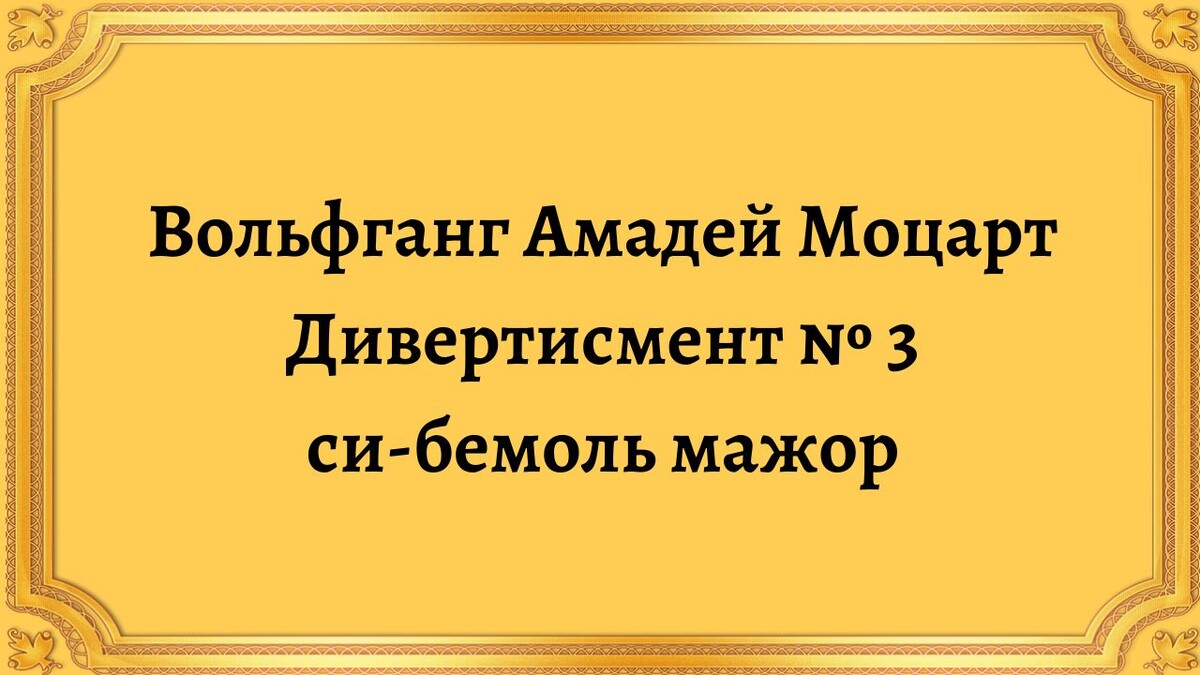 Дивертисмент № 3 си-бемоль мажор Вольфганга Амадея Моцарта, K. 229, — шедевр классической музыки, написанный в 1778 году. Это очаровательное музыкальное произведение написано для струнных инструментов и состоит из двух скрипок, альта, виолончели и контрабаса. Дивертисмент - менее известное сочинение Моцарта, но, тем не менее, оно является неотъемлемой частью его творчества и демонстрирует его музыкальный талант.