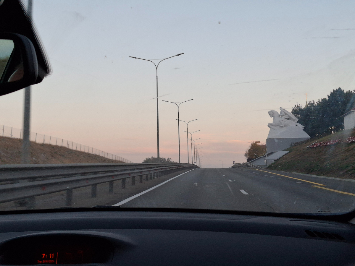 На Кубани в гостях мы были неделю. В четверг 31 октября в 6 утра выехали в обратный путь. В станице Павловской (1195 км) свернули на М4. Дальше по этой дороге до Москвы. Памятник казакам в станице Кущевской Краснодарского края. В Краснодарском крае мы проехали по одному платному участку (1195-1119 км). Цена 250 руб. Покидаем Краснодарский край. Ростовская область. Здесь 4 платных участка (цена 120, 330, 150 и 480 руб.) Туман. Памятник невернувшимся. С одной стороны дороги стела с журавлями. С другой - фигура матери. До Москвы 1000 км. Первая остановка в 9 утра. Щенки-подростки живо интересовались собакой Кирой :) Едем дальше. Собака Кира спит. Я сижу сзади и периодически смотрю, как она там. Заморосил дождь. Впереди Каменск-Шахтинский. Парк Патриот в Каменск-Шахтинском. Впереди Воронежская область. Время 11 часов. Платных участков 4 (500, 150, 270 и 120 руб.). Вторая остановка в 12 часов. Дождь. Хорошо, есть столы под навесом. Воробьи спрятались от дождя :) Едем дальше. Ливень. Но мы о