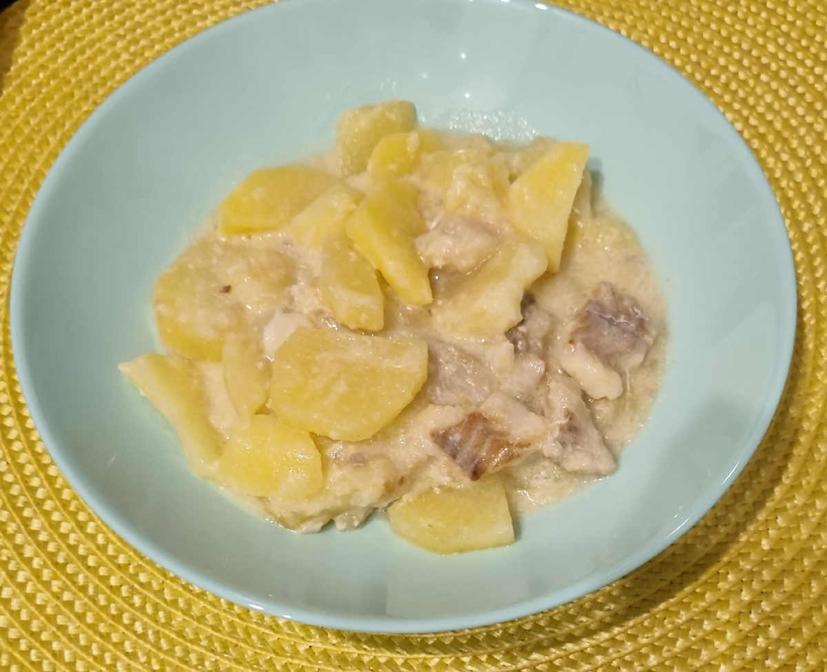 Как говорит муж: " Это самое вкусное блюдо из рыбы, которое ты делаешь!" И, поверьте, это не потому что я рыбу готовить не умею)))))) Это и правда очень вкусно. Раньше мне в этом блюде нравилась заливка, мне ничего не нужно было кроме этой заливки и куска белого хлеба, чтобы помокать им. Это было офигенно вкусно! Сейчас я не такой фанат белого хлеба, поэтому и заливки стало меньше)) Ингредиенты: 600 г филе минтая 1 большая луковица 4-5 больших картофелин 200-300 мл молока Масло сливочное, топленое для пропускания Зелень (укроп, лук) Начинаем готовить: Лук режем полукольцами, припускаем его на распустившемся топленом, сливочном масле, не на сильном огне. Филе минтая режем средними кусочками, добавляем к луку, припускаем до побеления рыбы. Добавляем порезанный картофель и заливаем молоком. Количество молока смотрите сами, оно должно полностью скрыть картофель с рыбой. Можно молоко разбавить с водой, это кому как нравится. Тушим на маленьком огне до готовности картошки. Посыпаем зеле