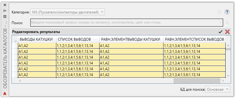 Если выбрать Размыкающий тип контакта, ввести через запятую номера выводов (например, 22,23) и нажать кнопку ОК, то в «Обозревателе каталогов» в поле «Список выводов» отобразится следующий текст: тип контакта (2) и через запятую номера выводов.