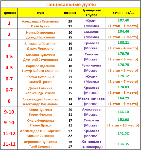 Несмотря на всенародную любовь Варя Жданова/Тимур Бабаев-Смирнов опустились в рейтинге относительно прошлого сезона, а все потому, что их обошла большая группа бывших юниоров. С одной из таких пар (Милана Кузьмина/Дмитрий Студеникин) на предстоящем этапе Варя с Тимуром будут соперничать за 4 место. Будущий пьедестал этапа очерчен достаточно четко. Лиза Пасечник/Дарио Чиризано сделают еще одну попытку чисто откатать обе свои сложнейшие программы, с большим количеством "трюковых" элементов. При этом задача-минимум совпадает с задачей-максимум - занять 3 место и набрать больше 190 баллов.