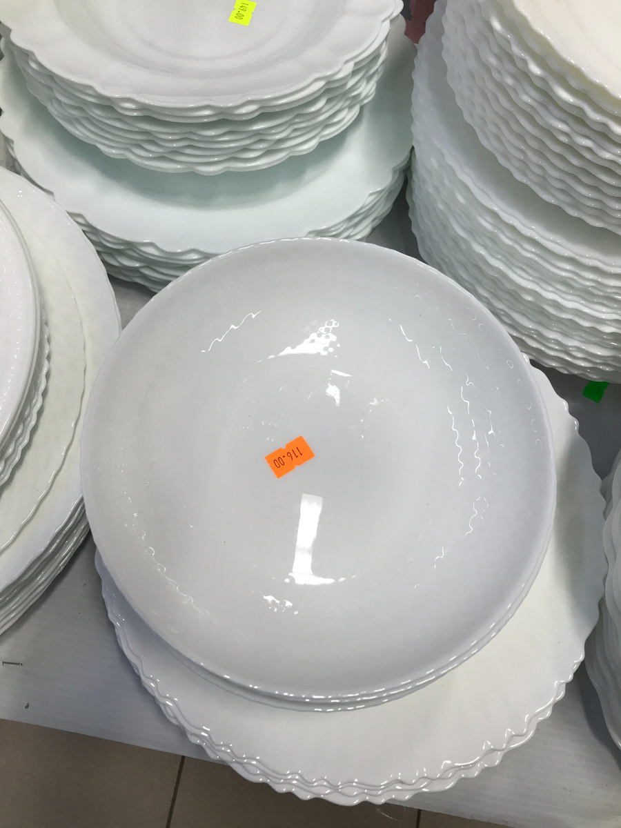 Зашла на пять минут, а застряла на час...Обнаружила на полочках классные новинки и решила поделиться с вами. А начнем сегодня обзор с нашего любимого кухонного отдела. Белоснежные тарелки из опалового стекла. Ассортимент отличный, качество на высоте. Можно собрать обеденный сервиз для повседневного использования. Цена 116 руб. Гладкая поверхность, очень легкая. Цена 149 руб. Лаконичный дизайн, прекрасно будет сочетаться с другой посудой Цена 174.50 руб. Удобная посуда для подачи овощных салатов, фруктов Состав: опаловое стекло. Цена 124 руб Можно использовать ,как подстановочную Цена 79 руб. Интересный дизайн: волнистый край. Цена 99 руб. Отличный вариант для подачи вторых блюд Стильная тарелка с неравномерными волнистыми краями Стоимость: 149 руб Украшена цветочным узором. Цена 69 руб Ух ты, какая прелесть! Как вариант, подойдет для праздничной сервировки стола Выполнен из фарфора. Цена 349 руб. Дизайн с золотой каймой станет украшением стола Большой салатник на общий стол, очень в