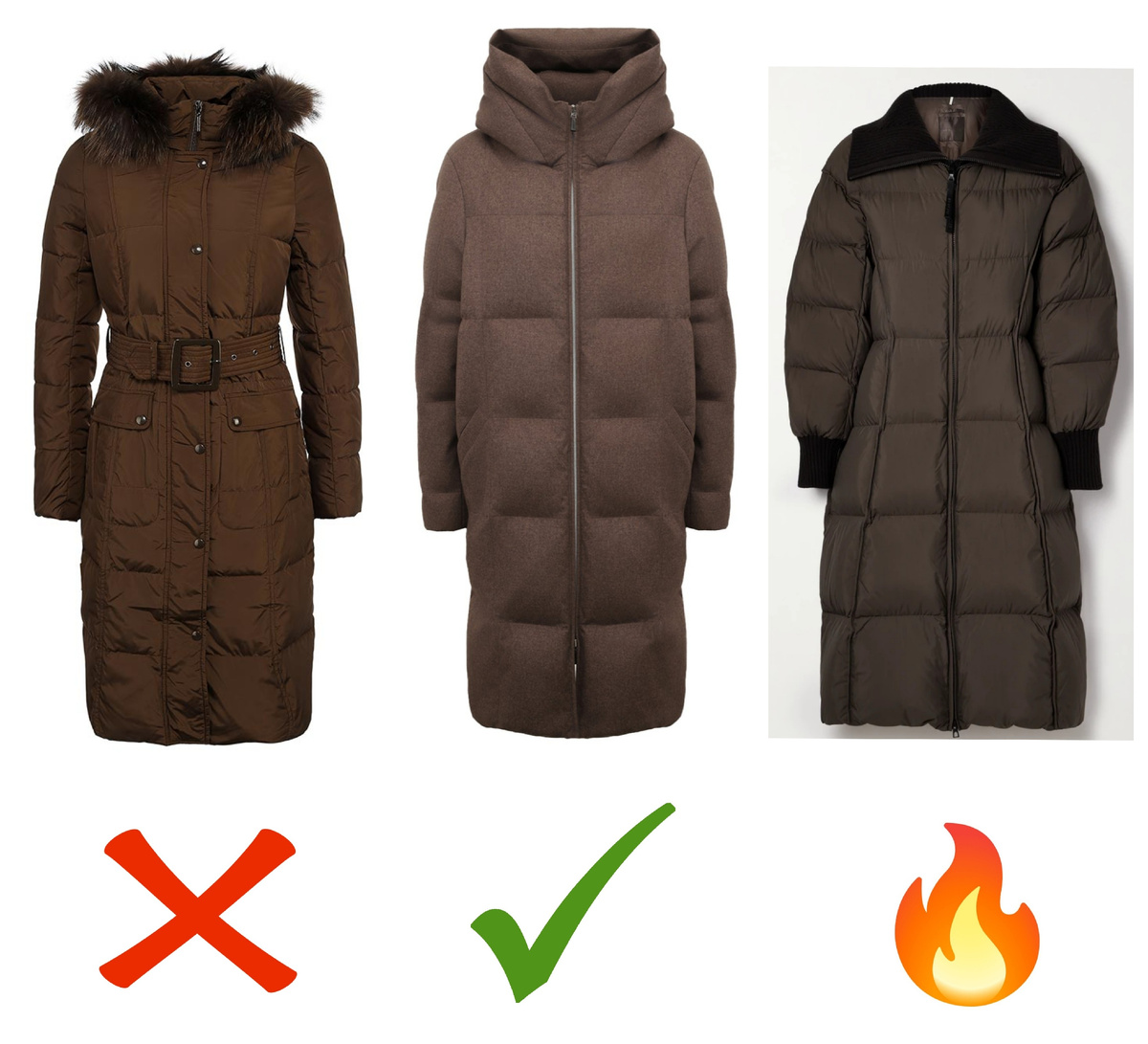 ❌Устарело: Блестящий материал, меховой вороник и косая застежка - сразу все устаревшие детали собраны в первой модели зимней куртки. Такую куртку сложно будет стилизовать в современный образ и сделать ее универсальной. Кроме того все эти детали способны сделать образ более "дешевым".