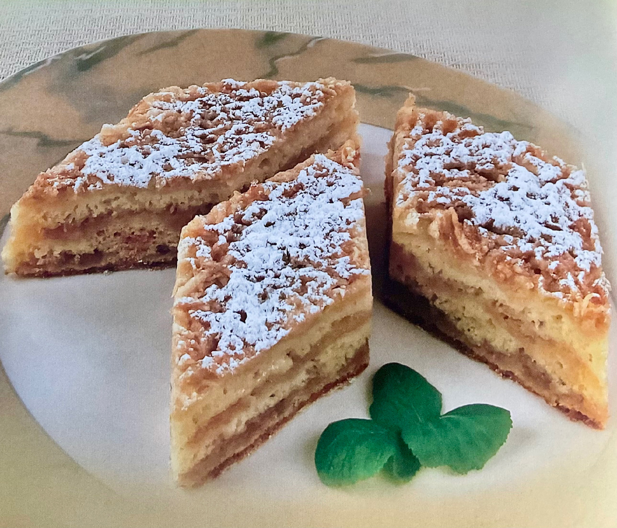 - Горячий пирог посыпьте сахарной пудрой и нарежьте ромбиками.