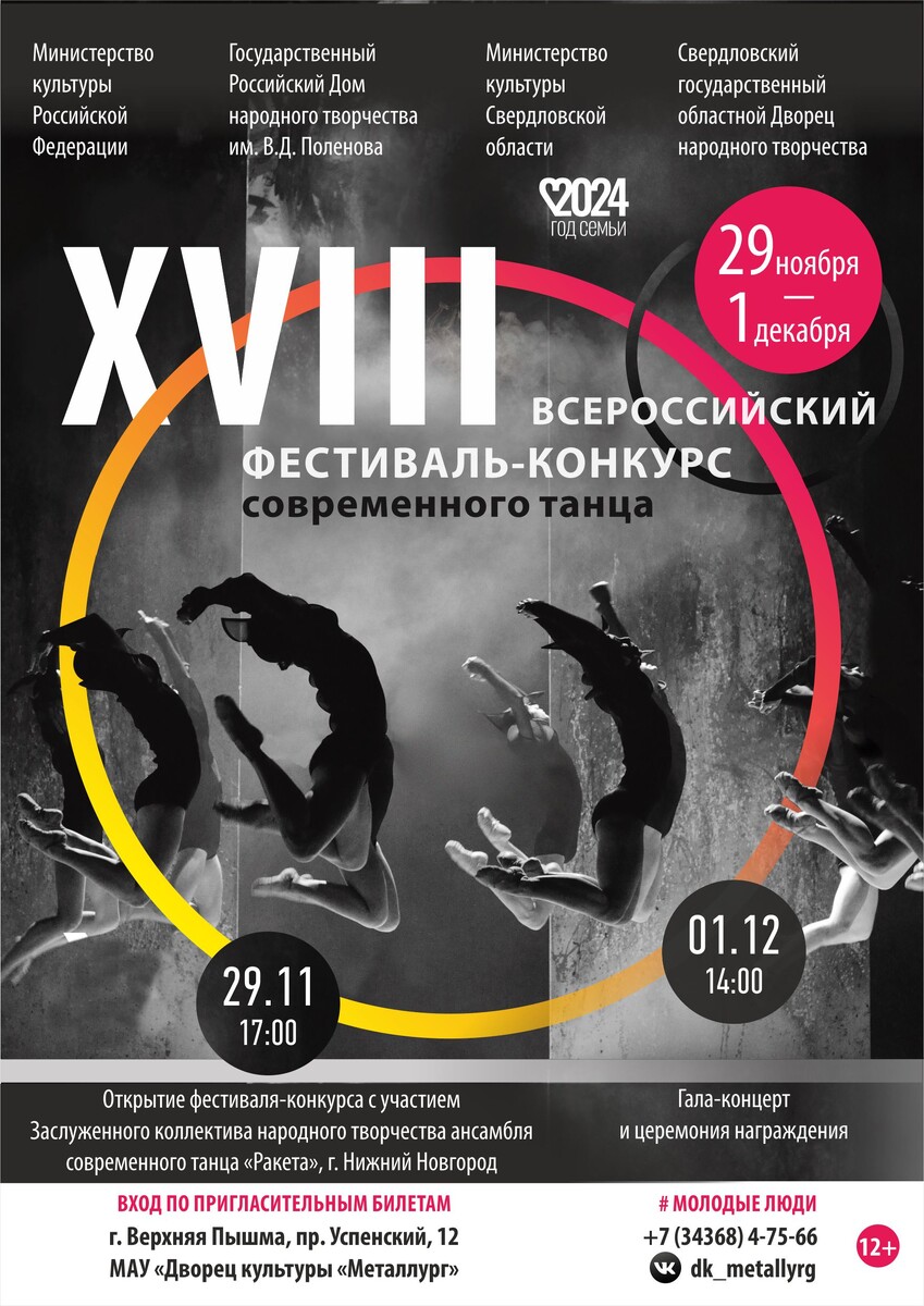Заключительный этап XVIII Всероссийского фестиваля-конкурса современного танца пройдет с 29 ноября по 1 декабря 2024 года в МАУ Дворец культуры «Металлург», г. Верхняя Пышма Свердловской области.