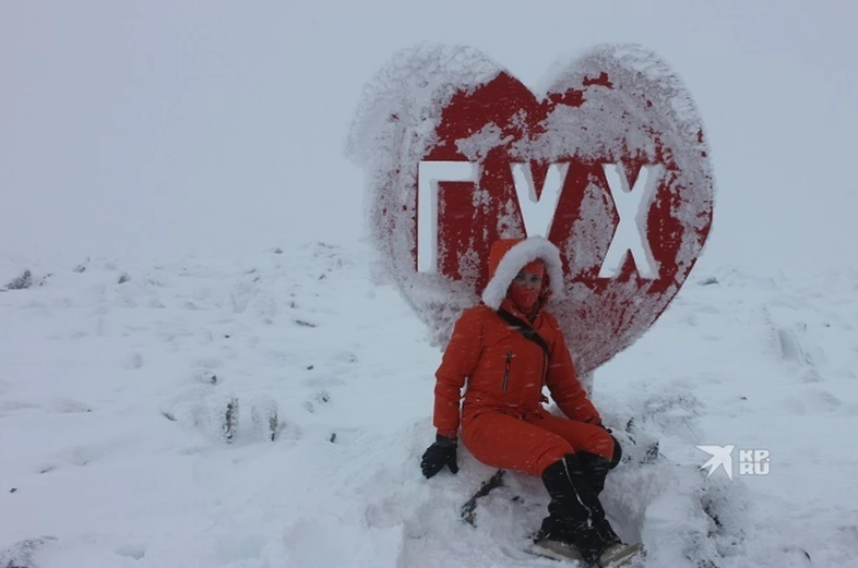 По ощущениям на высоте было примерно -11 градусов. Но ветер буквально сбивал с ног, а снег обжигал лицо. Ноги утопали в сугробах. Здесь же на вершине есть арт-объект «сердце ГУХа» - это здоровенное железное сердце. Кто его туда поднял – загадка. Там же есть и железные качели, большой крест. Здесь можно сделать красивые кадры.