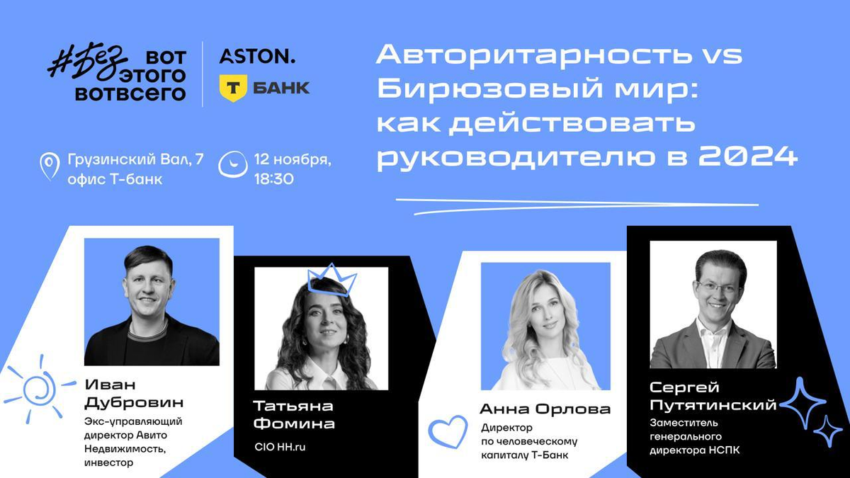 Вчера был на очередном крутом мероприятии от Aston / Faust Consulting, которое в этот раз проходило на площадке Т-Банка. Темой встречи было противопоставление Авторитарности ("Красного стиля управления") и Холакратии ("Бирюзового стиля управления"). Список спикеров был огненным: ⭐️ Анна Орлова, Директор по человеческому капиталу Т-Банка; ⭐️ Сергей Путятинский, заместитель генерального директора НСПК; ⭐️ Татьяна Фомина, CIO ГК HeadHunter; ⭐️ Иван Дубровин, Инвестор, экс-управляющий директор Авито Недвижимость. Несменный организатор и модератор встреч Сергей Щербинин вскрыл очень интересные мнения и выражения от спикеров. Сделал для себя много заметок и частью хочу поделиться с вами: — Вопреки расхожему мнению, обычно компании не развиваются по знаменитой спирали от "красного режима" к "бирюзовому", а скорее наоборот. Любая компания начинается с 2-5 человек, и даже при медленном росте на старте структура остается плоской: Каждый делает свое дело, но все в курсе дел друг друга и всегда