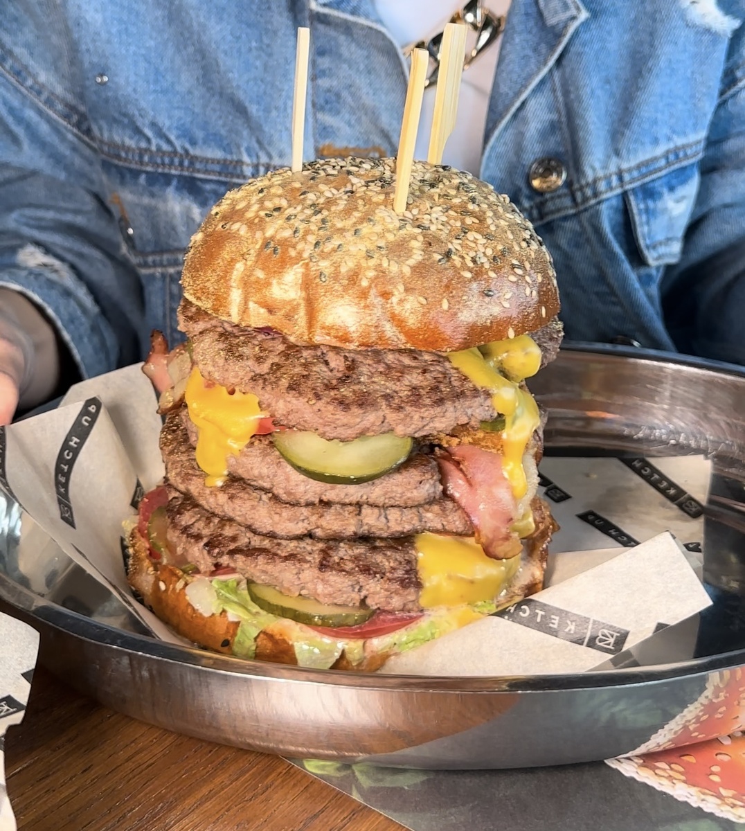 Большой Бургер почти в 1кг!! с четырьмя котлетами из мраморной говядины, двумя хашбраунами, сыром чеддер, карамелизированным луком, соусом BBQ и сусальным золотом. Настоящее наслаждение для любителей бургеров, но одним вы его точно не осилите. Заказать его можно в стильном ресторане Ketch Up, у них 2 филиала по Москве.