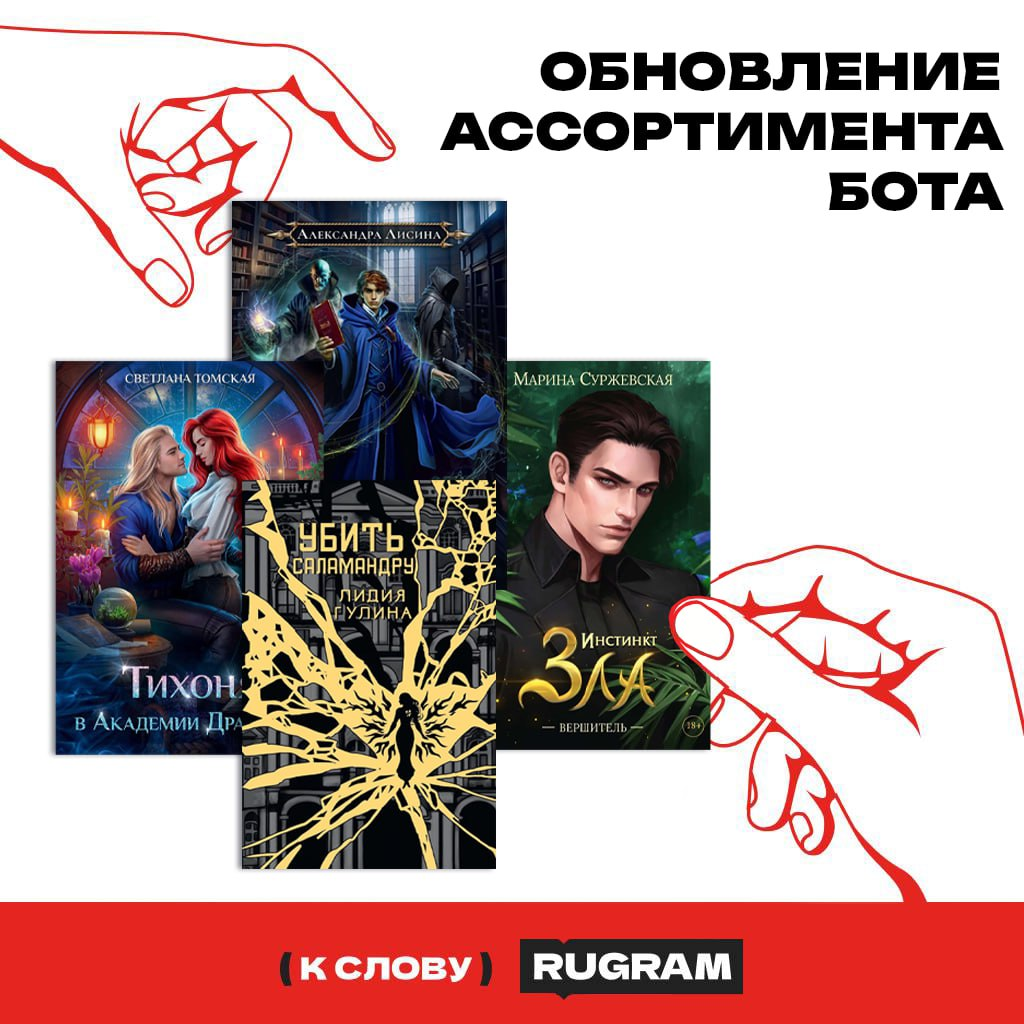 Всем привет! Давно не виделись! Несу обещанную информацию по моей книге "Убить Саламандру"! Вчера в телеграм-боте издательства Руграм начался долгожданный многими предзаказ "Саламандры", и вот так красиво он представил мою книгу! Смотрите, она даже перекрывает книги позади! Хе-хе. А ведь там давно издающиеся авторы! Открытие предзаказа — это праздник! А что происходит по праздникам? Правильно — дарят подарки. Ваш лучший подарок — поддержка автора оформлением предзаказа. Я в свою очередь в благодарность тем, кто купит книгу до выхода, подарю сюрприз. 🎁 Каждый, кто оформит предзаказ, получит открытку с одним из ключевых персонажей и удобную закладку. 🎁 Среди предзаказавших я проведу розыгрыш книжного бокса с атмосферными и приятными подарками внутри (открытки, закладки, сюжетные странички и кое-что ещё). 🔥 Подписаться на меня в телеграм-канале 🔥Оформить предзаказ в боте издательства Руграм (К слову). 🔥 Оставить скриншот в комментариях и получить взамен порядковый номер 🔥 Вы великол