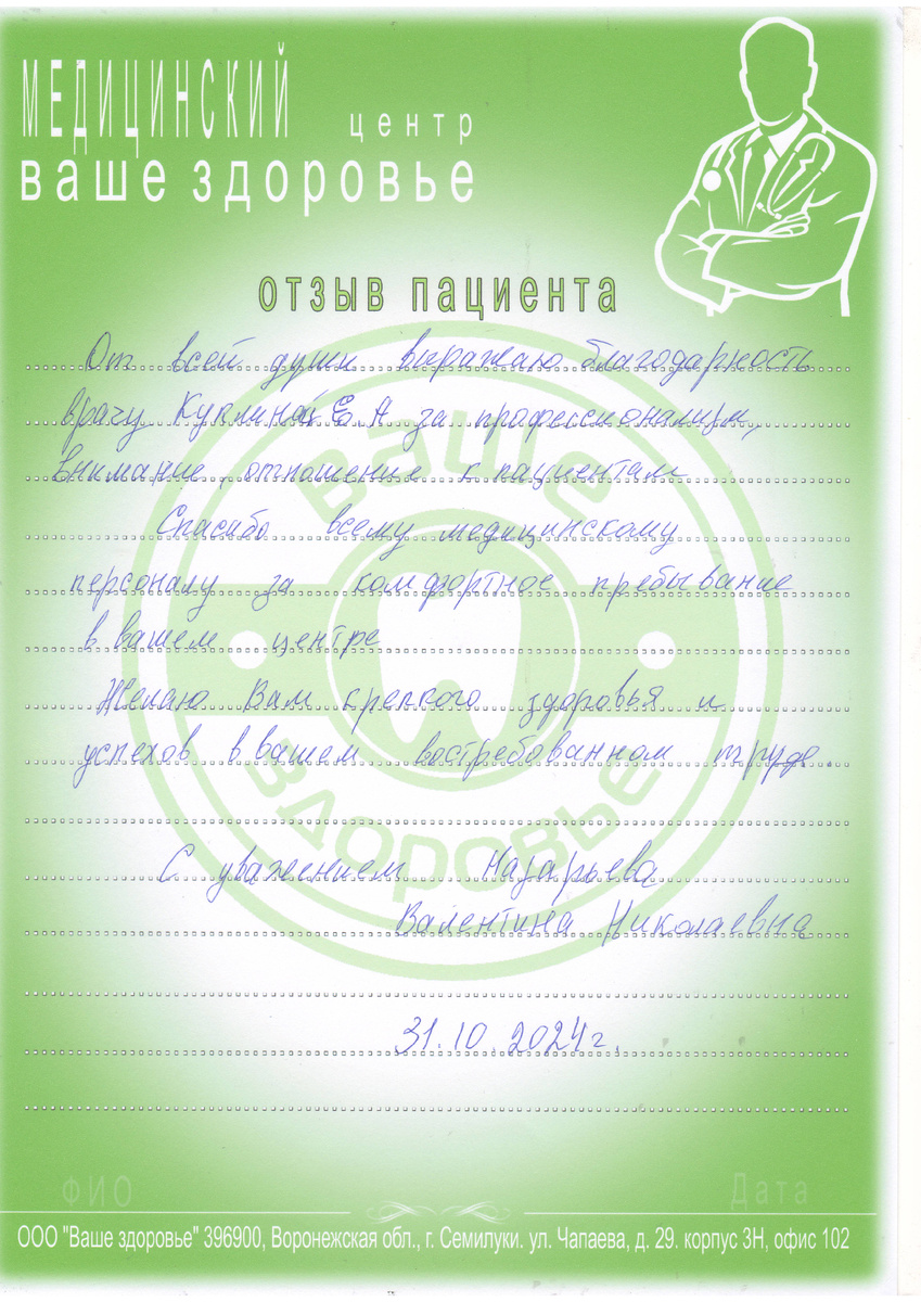 Спасибо всему медицинскому персоналу за комфортное пребывание в вашем центре.