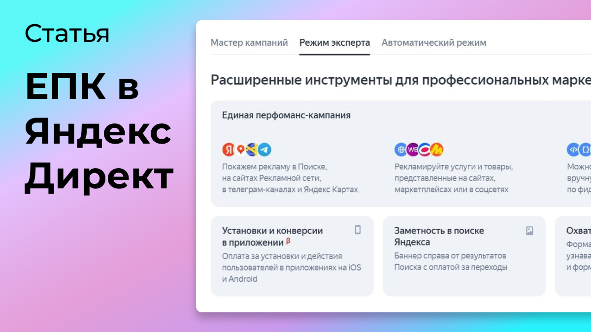 Единая перформанс кампания (ЕПК) – это новый формат кампаний, который объединяет в себе несколько разных форматов: РСЯ, поиск, карты, организации на поиске, товарная галерея, реклама в Телеграм.