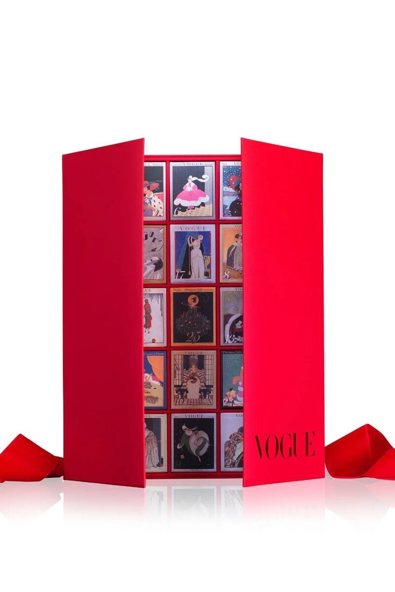 Начнем с классики — очень красивый новогодний адвент Vogue: во-первых, посмотрите на эти окошечки в стиле винтажных глянцевых обложек. А, во-вторых, на наполнение: внутри уход, массажеры, свечи с парфюмы от Foreo, Murad, K18, Dr. Barbara Sturm, Tatcha.