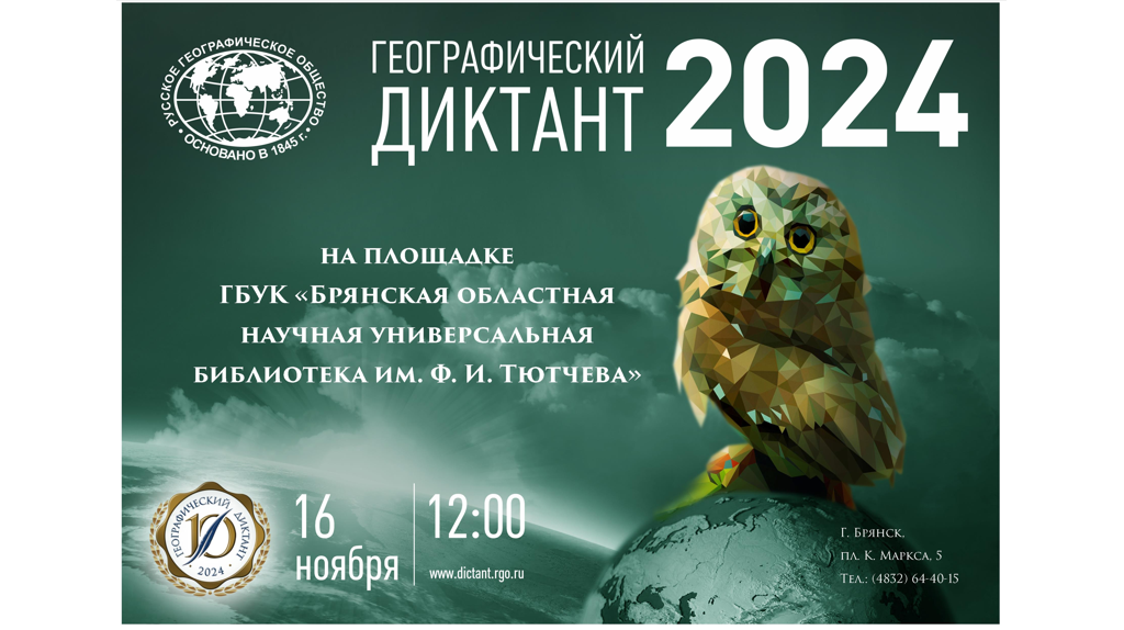 В Брянске 16 ноября пройдет «Географический диктант». Площадкой международной просветительской акции в нашем городе станет областная библиотека имени Тютчева. На мероприятие приглашены студенты БГИТУ, читатели специальной библиотеки. Также написать диктант могут все желающие.