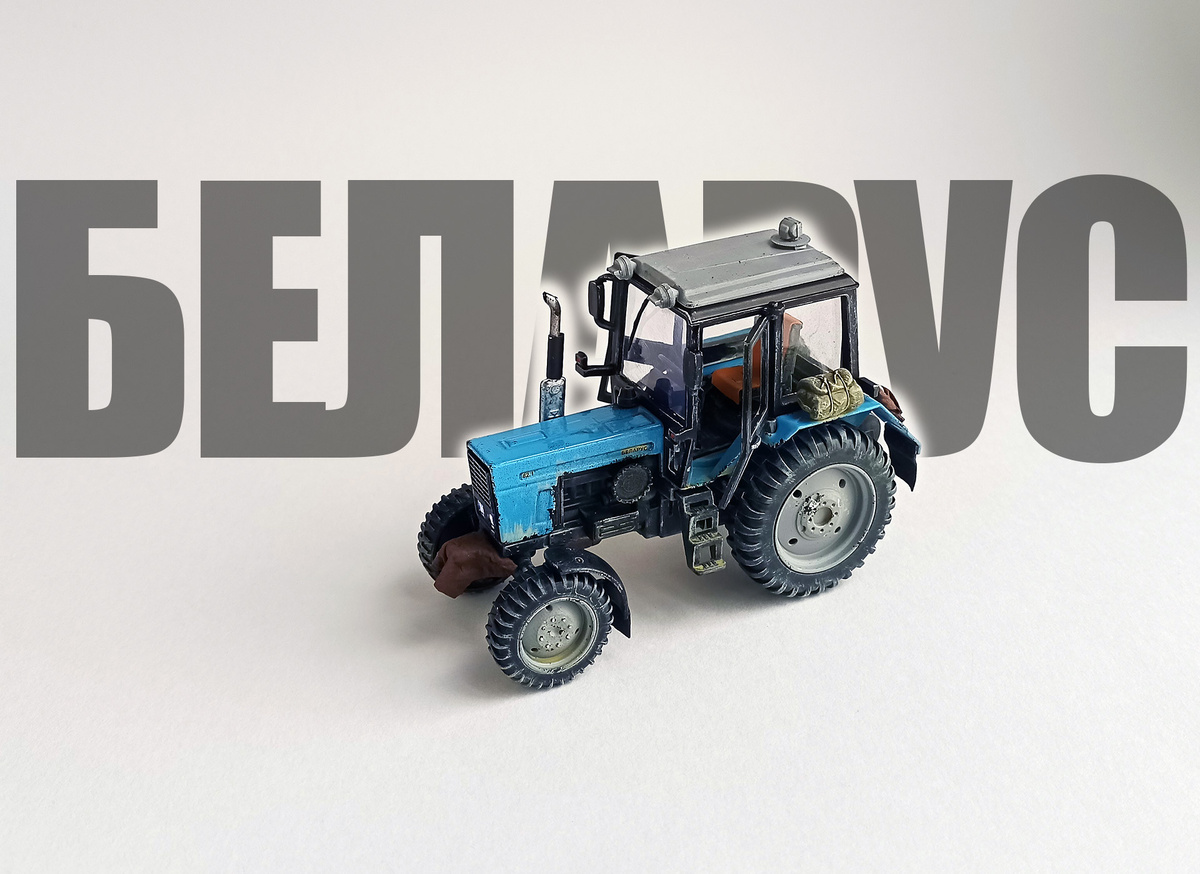В прошлой статье я рассказал про два игрушечных трактора, которые стали прекрасными дополнениями для подставок в 35-м масштабе. А сейчас речь пойдёт тоже об игрушечном тракторе, но уже с запросом в копийность. Итак, это трактор "Беларус 82.1" от фирмы "Технопарк" стоимостью 674 рубля. Игрушка с металлическим корпусом, инерционным механизмом, загорающимися фарами и звуком. Да, проблем у этой игрушки выше крыши, если смотреть на неё именно как на модель трактора, а не как на детскую игрушку. Прежде всего, навесное оборудование выглядит ужасно. Колёса пустотелые и односторонние (внутренняя сторона полая и там нет боковой части покрышек). Лобовое стекло отлито вместо с дворником. И потому я снял отвал и ковш, добавил кое-каких деталей, перекрасил трактор. Получилось что получилось: Игрушка перестала казаться именно игрушкой и стала похожа на модель, пусть и с низкой детализацией и видимыми недостатками. Кстати, размер игрушечного трактора вполне вписывается в 35-й масштаб - я промерил габа