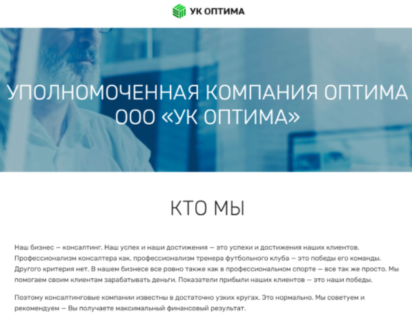 Внезапное появление. Как показывает наша практика, практически все финансовые пирамиды появляются буквально из ниоткуда, так вышло и с ООО “УК Оптима”. При этом сотрудники компании заявляли, что организация работает уже 15 лет. А при проверке информации оказалось, что компания существует около года.