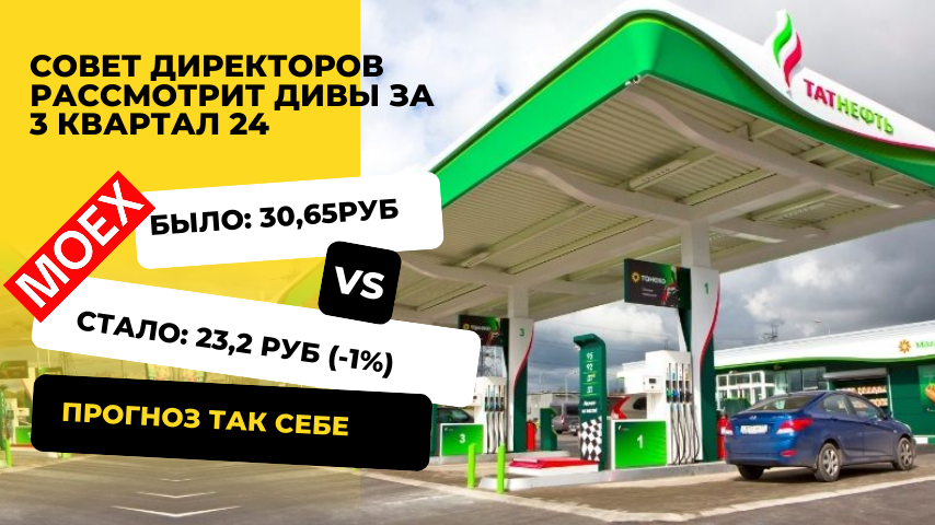 Сегодня 13 ноября Совет директоров Татнефти собирается или как обычно нет)))) чтоб утвердить дивиденды за 9 месяцев 2024 года. Прогноз не самый приятный для инвесторов : При лучшем раскладе дивы будут 23,2 рубля за акцию. Ну и это не самый плохой прогноз , кто-то оценивает их в диапазоне 17-24 рубля По новому прогнозу на 25 год выплаты упадут с 15,15% до 13,8% 🎯 ИТОГО: Январские выплаты дивидендов с 30,65 руб упадут до 23,2 руб _____________________________________________________________________ 👍 Спасибо что дочитали до конца - с вас лайки и подписка!))