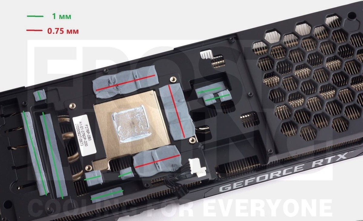 Приветствую читателей! Мы продолжаем нашу рубрику по толщинам термопрокладок на различные вендоры и сегодня затронем видеокарты от Palit. Расскажем какие толщины использовать при обслуживании и поведаем про нюансы систем охлаждений. Система охлаждения сплошной кошмар! Плата очень маленькая, так еще и присутствует "бутерброд". Непонятный фронт-плейт, который адекватно не передаёт тепло в основной радиатор. На памяти установлены термопрокладки 0.75 мм, на зоне VRM 1 мм. Для данной видеокарты советуем устанавливать мягкие термопрокладки на 20Вт/мК, есть все нестандартные размеры! Наверное самая противная видеокарта из всех видеокарт которые встречались. Очень капризная видеокарта, без костылей не работает. Как только вы видите что температура Hot spot начинает взлетать от 95 до 105 градусов, то сразу нужно обслуживать! На памяти установлены термопрокладки 0.75 мм, на зоне питания и VRM 1 мм и 1.5 мм Для данной видеокарты нужны мягкие термопрокладки! С твердыми термопрокладками будет пе