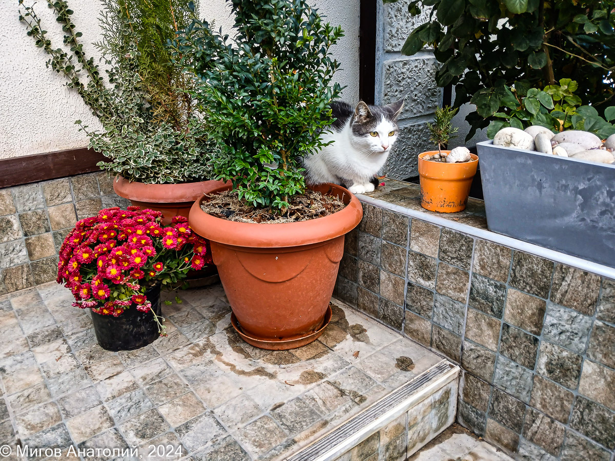 Возвращались из Феодосии, остановились на обочине дороги в Изюмовке и купили небольшой кустик шаровидной хризантемы. У нас таких много в саду. Но вот эту красную хризантему решили взять специально для того, чтобы поставить на крыльцо. Потом, когда она отцветет, посадим в саду, но пока пусть украшает парадный вход. Накануне ночных заморозков, которые приходили в наш Старый Крым в начале ноября, мы занесли в дом горшки с геранью. Она холодов не любит. И наше крыльцо сразу осиротело. Остался тут только большой горшок, в котором растет небольшой саженец восточной туи и в нём же кустик бересклета. Бересклет, как и туя, морозов не боятся и прекрасно уживаются в одном горшке. Бересклет был совсем маленьким, когда Лена его посадила, но он быстро разрастается и даже пытается карабкаться вверх, цепляясь за неровности фасада. Ещё один росток восточной туи в маленьком горшке. Между прочим, обе эти туи выросли у нас самосевом, из семян, упавших на землю под большими туями. А ещё один горшок, которы