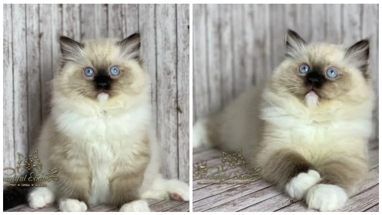 Автор объявления уточнила, что питомец – мальчик, имеет окрас «seal mitted», что значит пойнтовый окрас с белым, цвет на передних лапках расположен симметрично на обеих конечностях и не выходит за линию сгиба лапки, на задних конечностях расположен симметрично и не выходит за пределы скакательного сустава.