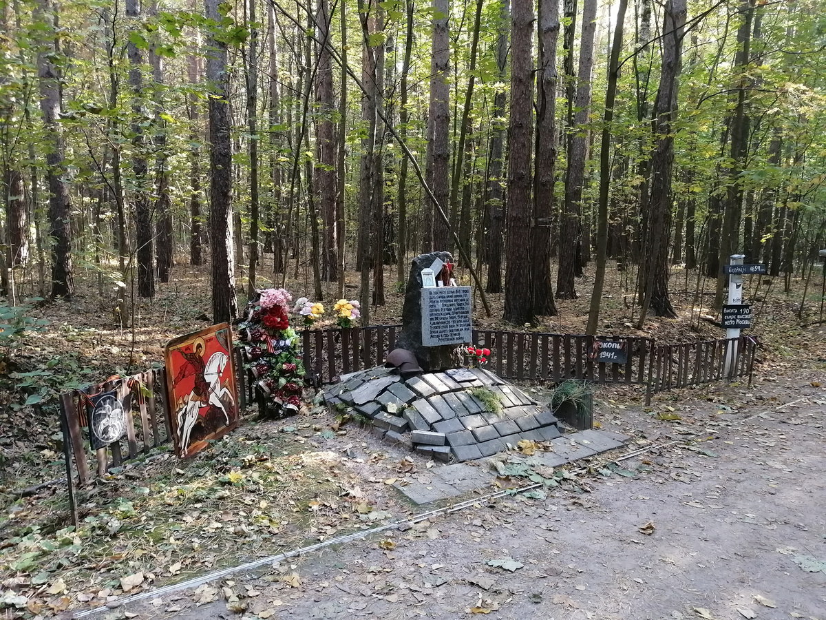 В Чоботовском лесу есть обелиск обороны Москвы в Ново-Переделкино. Согласно статье, https://raenza.ru/blogs/wizard/4060 он появился в 2016 году. На этом месте осенью 1941 года проходила ближняя линия обороны города Москвы, построенная жителями деревень Переделкино, Чоботы, Рассказовка, Федосьино совместно с военнослужащими 564 истр.авиационного полка ПВО (аэродром Суково), 29 стр.див див.нар.ополчения, 261 зенит.артил.полка, 8 прожекторного полка, 54 зент.арт.див. Вечная память защитникам неба Москвы в годы Великой Отечественной войны. Внизу табличка с надписью: Слава Вам, павшие! Слава, бесстрашные. Вечную славу поёт вам народ. Доблестно жившие, Смерть сокрушившие, Память о Вас никогда не умрёт! Чуть поодаль указатель, что до Берлина 1854 км. Высота 190 - самое высокое место Москвы. По левую сторону Икона с изображением Георгия Победоносца, который поражает змея. Если продолжить идти вдоль леса, то неподалеку будет памятник жителям пос. Чоботы, погибшим на фронтах Второй мировой во