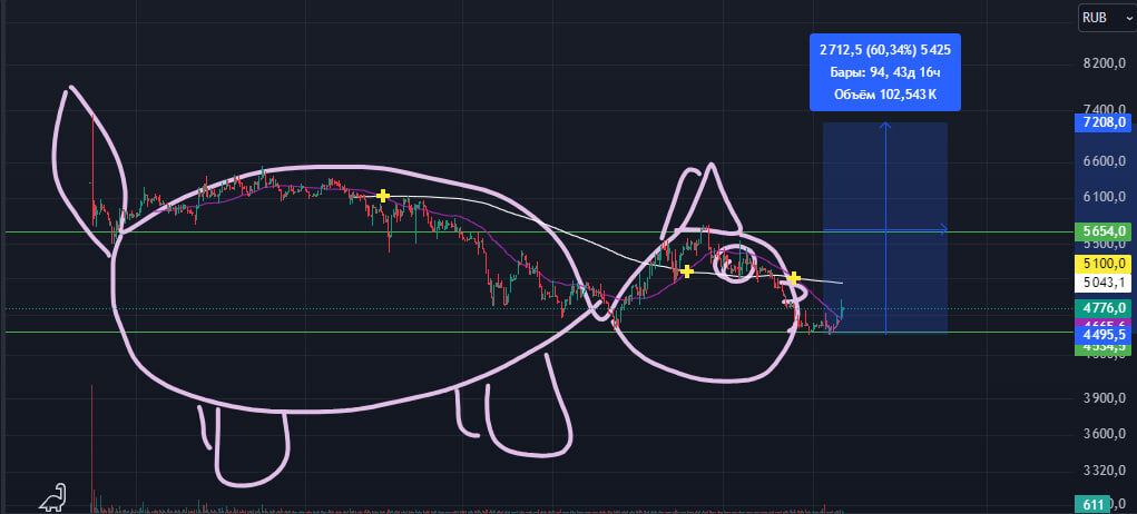 💻 $DIAS Начнём утро с улыбки! 😘 Фантазия трейдера, а то крышу у нас всех Скоро потечёт. 🤣🤣🤣 Похоже на котика? 🤣🤣🤣 Я конечно тот еще художник))) ✔️Актив diasoft на рынке совсем недавно, поэтому полноценно проанализировать его не получится, но, говорят, компания перспективная. 🟢Поддержка 4 534, в нее 2раза ударился и очень похоже, что пытается сформировать двойное дно. 🟢Подтверждением фигуры будет пробитие 2654, тогда увидим повышение цены. 📊Отработка примерно до 7100. 📉Если фигуру не подтвердит и развернется и пробьет поддержку, то движение вниз будет продолжено и скорее пойдет строить третью волну нисходящего тренда! Не ИИР #трейдер #диасофт #инвестиции #теханализ