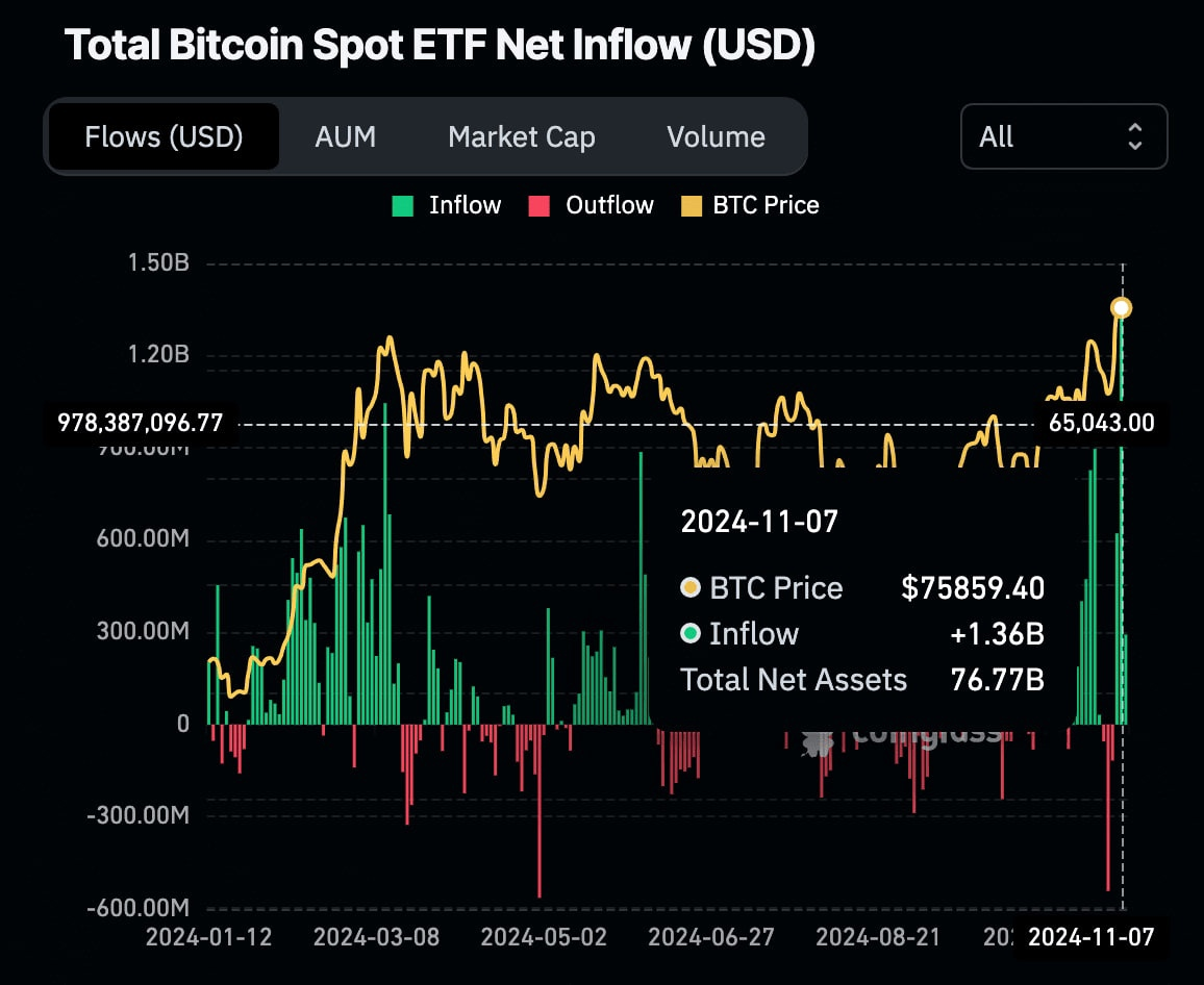 На прошлой неделе спотовые биткоин-ETF зафиксировали исторический приток в размере 1,4 миллиарда долларов всего за один день. Большая часть этой суммы — около 1,1 миллиарда долларов — была направлена в IBIT, фонд от компании BlackRock. Этот объем инвестиций за столь короткий срок не только подчеркивает высокий интерес к биткоину, но и символизирует сдвиг восприятия биткоина как долгосрочного актива.