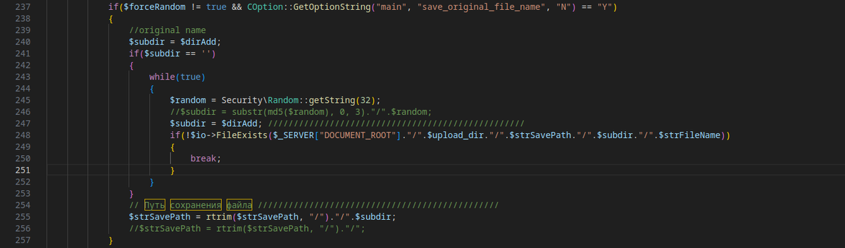а именно строкой: $subdir = substr(md5($random), 0, 3)."/".$random; За это отвечает фрагмент: Контроль от дубликатов файлов: Записали в массив исходное название файла $arFile["ORIGINAL_NAME"] = $strFileName; После изменения названия файла происходит запись в БД. Метод записи в БД