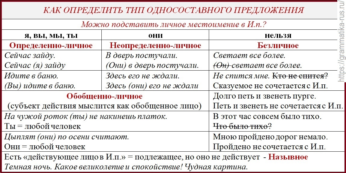 1) В определенно-личных предложениях сказуемое выражено в такой форме, которая имеет значение 1-го или 2-го лица единственного числа или множественного (действие производят: я, ты, мы, вы), т.е. в форме настоящего или будущего времени, а также повелительного наклонения (остальные формы глагола значения лица не имеют). Примеры: Хочу спать. Хотим спать. Хочешь спать? Хотите спать? Спи! Спите! 2) В неопределенно-личных предложениях сказуемое выражено глаголом обязательно в форме множественного числа, это может быть форма 3-го лица настоящего или будущего времени или же форма прошедшего времени, а также условного наклонения (действие производят Они). Пример: В киоске продают (продавали) газеты. 3) В обобщенно-личных предложениях сказуемое по форме совпадает со сказуемым в определенно-личном или неопределенно-личном предложении, однако значение предложения - обобщенное, т.е. действие совершает любой, каждый из нас, все. Примеры: Без труда не вытащишь и рыбку из пруда. Цыплят по осени счита