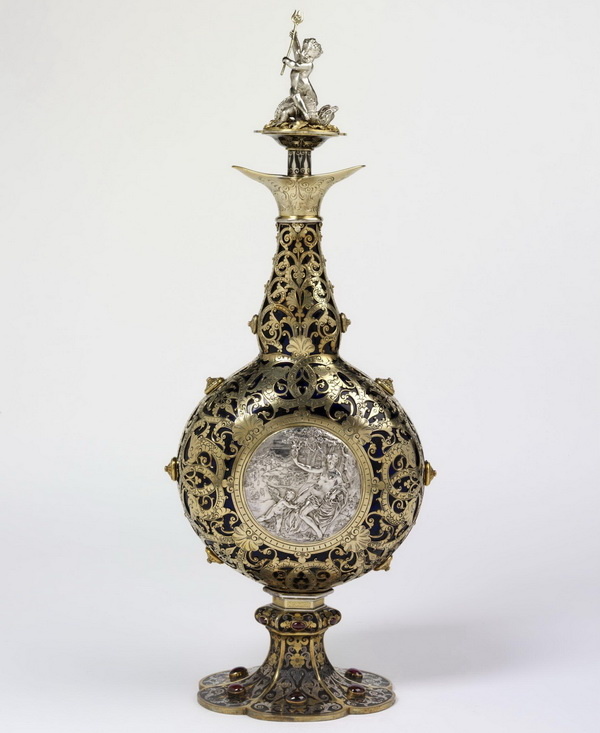Серебряная фляга с позолотой, чернением и гранатами, выставлявшаяся на Всемирной выставке в Лондоне в 1851 году, высота 40,5 см, Жюль Вьезе для Froment-Meurice, 1851 г., из коллекции музея Виктории и Альберта.