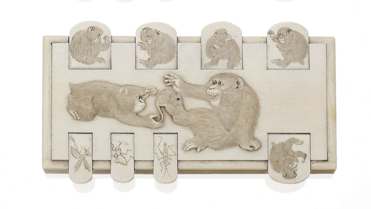 Это антикварный предмет: пластина из слоновой кости, украшенная рельефом с двумя играющими обезьянками. На откидывающихся крышечках изображены различные насекомые. Подобные изделия довольно часто встречаются и сейчас на британских аукционах, они были привезены из Японии и относятся к периоду Мэйдзи, длившемуся с 1868 по 1912 годы. Во время периода Мэйдзи в Японии правил император Мацухито, который провел много прогрессивных реформ, в том числе выдвинул требование «собирать знания по всему миру для укрепления основ императорского правления». В Японию хлынули товары и люди с запада, а обратно, соответственно, хлынули местные сувенирные изделия, по бо́льшей части с поправкой на западные вкусы. Вот еще несколько подобных вещиц, выполненных с использованием японской техники шибаяма. Шибаяма — это техника инкрустации на основе слоновой кости, дерева или лака. В Японию она пришла из Китая в семнадцатом веке. Чаще всего для инкрустации использовался перламутр разных оттенков, слоновая кость,