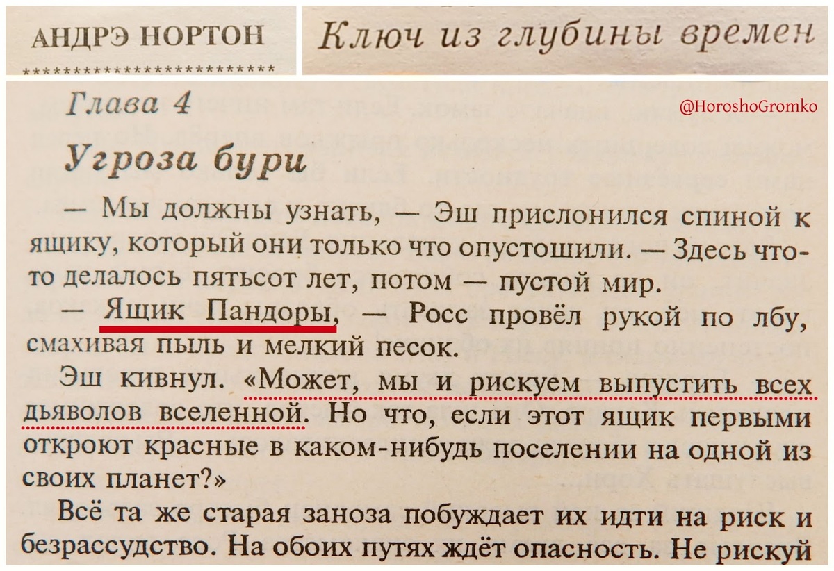 В фантастическом романе «Ключ из глубины времени» Андрэ Нортон есть фрагмент: Время действия наши дни, и человечество делится на два лагеря, капиталистический и «красных». Нортон во многие свои романы тему холодной войны включала. Неожиданно произошли некоторые события, в результате которых люди получили возможность летать к планетам других звёздных систем. Американцы и «красные» наперегонки устремились в космос, чтобы как можно больше планет себе застолбить. Планета Гавайка досталась американцам. Агенты во времени Росс и Эш прилетают на Гавайку и выясняют, что в прошлом планеты было какое-то катастрофическое событие. Герои хотят узнать, что произошло, хотя есть риск, что исследование приведёт к повторению катастрофы или ещё к какой-нибудь беде, то есть исследователи откроют ящик Пандоры и выпустят всех дьяволов. Кто такая Пандора? Согласно древнегреческой мифологии, Пандора первая женщина на Земле. Все существа женского пола, существовавшие до Пандоры, были богинями, а Пандора перва