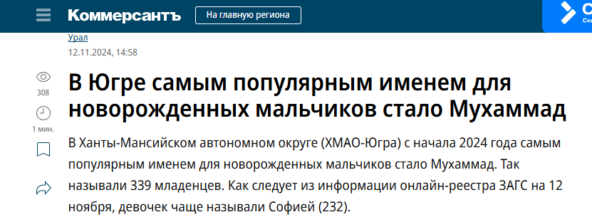В 2024 году Мухаммад стало самым популярным именем для новорожденных в огромном немусульманском регионе России - «Коммерсантъ»
