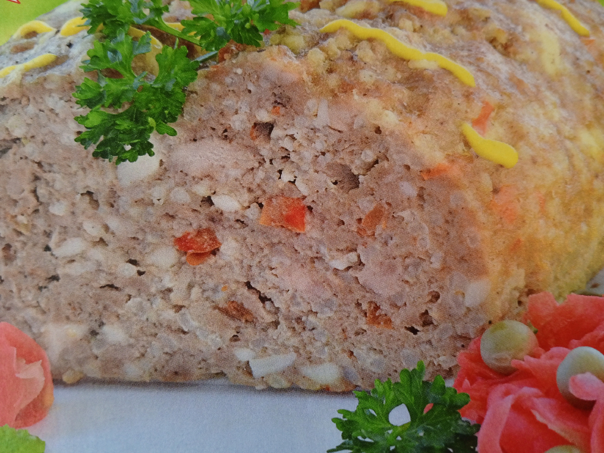 Продукты:600г мясного фарша, 70г отваренного пшена, 100 г плавленного сыра, 1 луковица, 1 морковь, 1 болгарский перец, 1 яйцо, 3 ст. л соевого соуса, 2 ст. л растительного масла, перец. Способ приготовления:Нарезанный мелко репчатый лук и натёртую морковь спассеровать на сковороде с растительным маслом. Отварить пшено в подсоленной воде. Нарезать кубиками болгарский перец. Натереть плавленный сыр. Подготовленные ингредиенты смешать с фаршем, добавить сырое яйцо. Приправить соевый соусом и чёрным перцем. Хорошо перемешать и убрать в холодильник на час. Смазать форму растительным маслом, выложить в неё фарш, уплотнить его. Поставить в разогретую духовку до 180% и готовить 40-45 минут. Мясной хлеб хорош в горячем виде -как основное блюдо или нарезать холодным как бутерброд. Приятного аппетита. Ваша Хозяюшка.