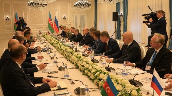 Находящийся с рабочей поездкой в Баку для участия в саммите мировых лидеров по климатическим действиям в рамках 29-й сессии Конференции Сторон Рамочной конвенции ООН об изменении климата (COP29) премьер-министр России Михаил МИШУСТИН провел переговоры с азербайджанским коллегой Али АСАДОВЫМ. Переговоры прошли в расширенном составе — с обсуждением значительного числа актуальных вопросов, что было подчеркнуто премьер-министром Азербайджана Али АСАДОВЫМ: «Отрадно, что вы находитесь в Азербайджане столь представительной делегацией. Считаем, что это еще раз подтверждает то значение, которое Россия придает развитию наших двусторонних взаимоотношений. В свою очередь Азербайджан также нацелен на дальнейшее укрепление и наращивание добрососедских отношений и взаимовыгодного сотрудничества и стратегического партнерства с Россией». Главой азербайджанского кабмина было отмечено, что Россия — один из важных торговых партнеров Азербайджана и судя по динамике роста взаимной торговли, в текущем году м