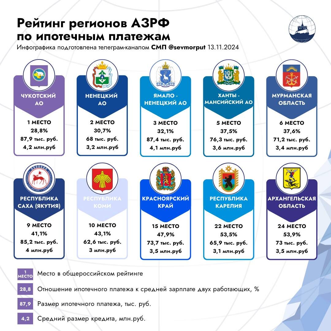 Ипотека наименее обременительна в «ресурсных» арктических регионах — самое благоприятное соотношение ипотечного платежа к средней зарплате двух работающих в 2024 году зафиксировано в Чукотском, Ненецком и Ямало-Ненецком автономных округах, следует из рейтинга РИА Новости. Соотношение рассчитывалось на основе аннуитетных платежей по фактическим кредитам за последние три месяца к средней чистой зарплате для двух работающих за 12 месяцев с сентября 2023 года по август 2024 года. Лидером национального списка стала Чукотка, где на выплаты по ипотеке у типовой семьи уходит всего 28,8% зарплат. На втором месте — Ненецкий автономный округ, где показатель составляет 30,7%. Третью позицию в рейтинге занял ЯНАО с соотношением 32,1%. В топ-10 общефедерального рейтинга из регионов АЗРФ также попали ХМАО (5-е место, 37,5%), Мурманская область (6-е место, 37,6%), Республика Саха (9-е место, 41,1%) и Республика Коми (10-е место, 43,1%). Красноярский край оказался на 15-й позиции с показателем 47,9