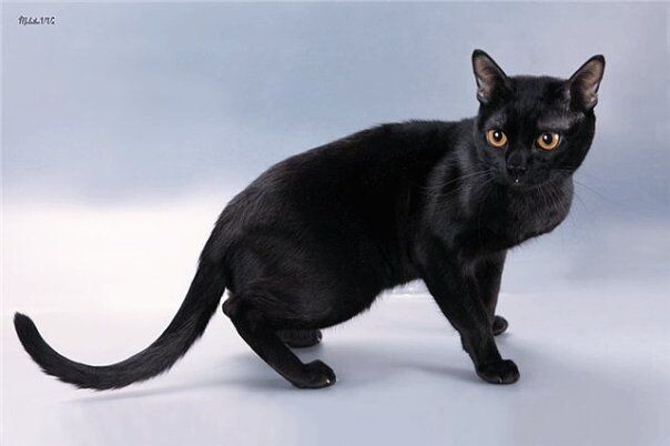 У бомбейских кошек даже подушечки на лапах чёрные Кажется, что эти кошки родом из детской страшилки, которая начиналась: «В черном-черном городе, на черной-черной улице, в черном-черном доме…» — видимо, там жила такая черная-черная кошка. Кто-то считает животных с таким окрасом мистическими созданиями, ведь есть предрассудок, что черная кошка приносит неудачу. Однако мы придерживаемся противоположного убеждения — полностью черные коты и кошки (впрочем, как и любого другого цвета) приносят лишь счастье! Наша сегодняшняя героиня — бомбейская кошка — обладает абсолютно однородным чёрным окрасом: у неё черные подушечки лап, чёрные усы и чёрный нос. Ничто не выдаст её в тёмной комнате — разве что янтарно-жёлтые глаза. Эта порода была выведена вовсе не в Индии, как можно подумать из-за названия, а в США — ее создатели мечтали иметь домашнюю мини-копию черной пантеры. И им это вполне удалось! Бомбейские кошки дружелюбны и нежны, легко привязываются к владельцу и любят помогать ему во всех дел