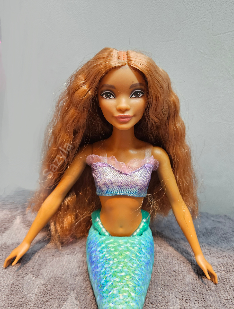 Несмотря на то, что римейк диснея по русалочке мне не понравился, я приобрела аж несколько персонажей по нему. Из общего для всех могу сказать, что хоть "экономика и должна быть экономной" мне не нравится их видимая дешевизна, тогда как это и не самые бюджетные выпуски. Про шарниры тут уже никто не вспоминает, но можно было хотя бы хвосты сзади тоже покрасить. Типа раз это игровушка, то остальное дети должны додумать сами? Именно эта деталь печалит меня скорее в глобальном смысле, чем в прикладном: мои куклы будут статично сидеть в красивых позах, так что заднюю часть я видеть не буду. Вот что меня расстраивает еще и в практическом плане - это лютые пиксели. Если на глазах из-за размера и разных цветов это почти незаметно, то губы мне всем троим пришлось перекрашивать. Потому что я эти пиксели уже издалека вижу. В отношении внешности новой Ариэль я все еще прохожу стадии принятия. Я уже спокойно отношусь к "перекрасам" персонажей. Но вот сам ее дизайн... Такое впечатление, что дизайн
