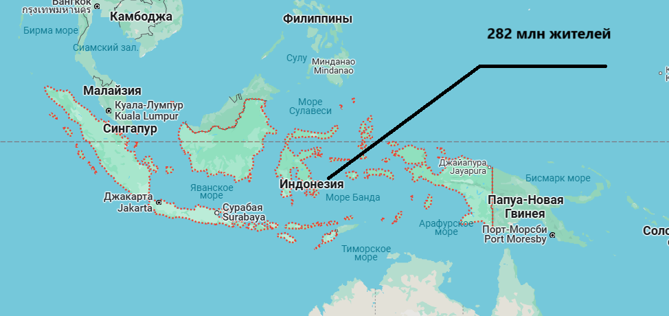 Однако почему же населения тут аж в два раза больше чем у нас в России? На одном только индонезийском острове Ява 150 млн душ разместилось - как во всей наше стране вкупе с новыми регионами... При том, что Россия аж в 9 раз больше Индонезии - 17 млн квадратных километров против 1,9 млн.