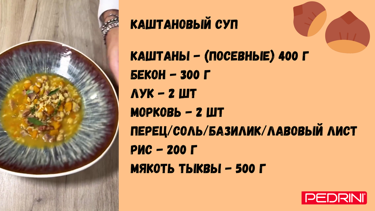 Как бы ни было очевидно, начинаем готовить с каштанов. Берем примерно 400 грамм и отвариваем их в кипяченной воде, около 40 минут. Затем идет, знакомая для всех, процедура готовки зажарки для супа. Берем две луковицы, две моркови и грамм 300 бекона. Все режем крупно и обжариваем минут 15. В этот момент, добавляем приправы, на ваш выбор. Сегодня мы взяли базилик, лавровый лист и, по классике, соль с перцем. Добавляем к зажарке мякоть тыквы (500 грамм), нарезанную крупными кубиками и заливаем водой. В момент кипения воды, добавляем рис 150 грамм. Все вместе готовим до момента, когда овощи станут мягкими. К, уже готовому, супу добавляем заранее отваренные каштаны, тщательно перемешиваем и… Готово!!! Перед вами обычный суп с необычными ингредиентами, где каштаны заменяют картошку. А благодаря тыкве и специям, блюдо имеет чуть сладковатый оттенок. Сытно и интригующе. К слову, каштаны являются великолепным антиоксидантом. Содержащийся в них магний, благотворно влияет на нервную систему. К